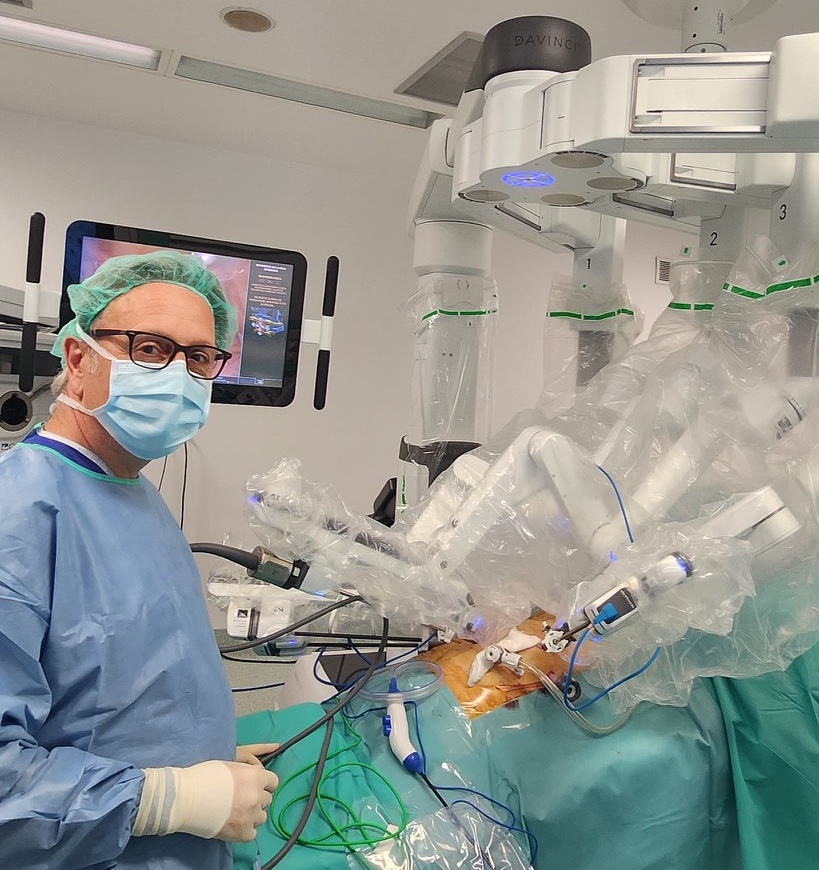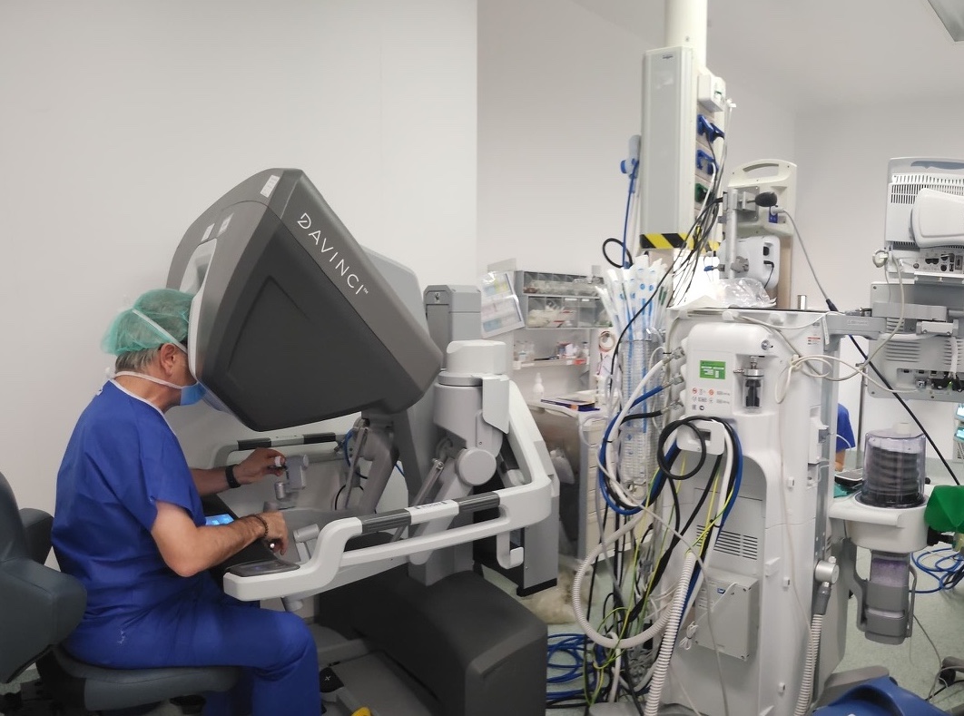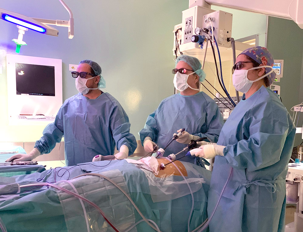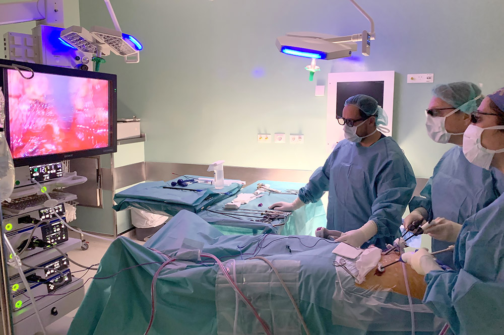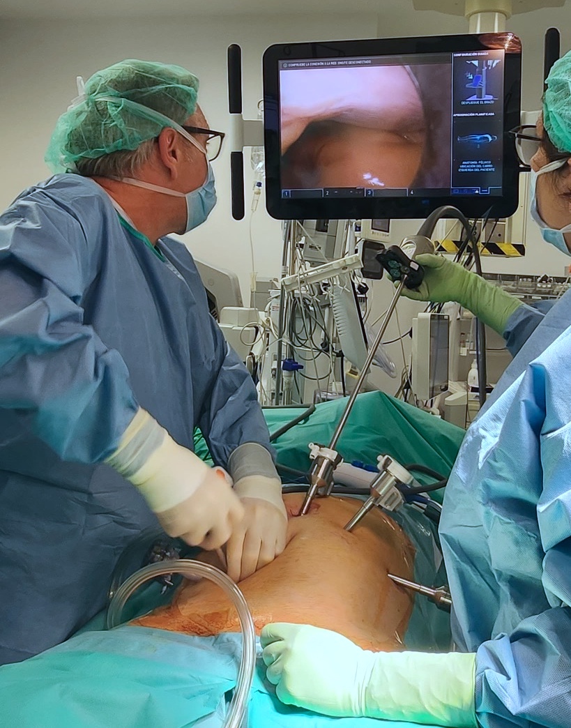 Realització d’una cirurgia. Al fons podem veure la columna de laparoscòpia amb el monitor d'alta resolució.